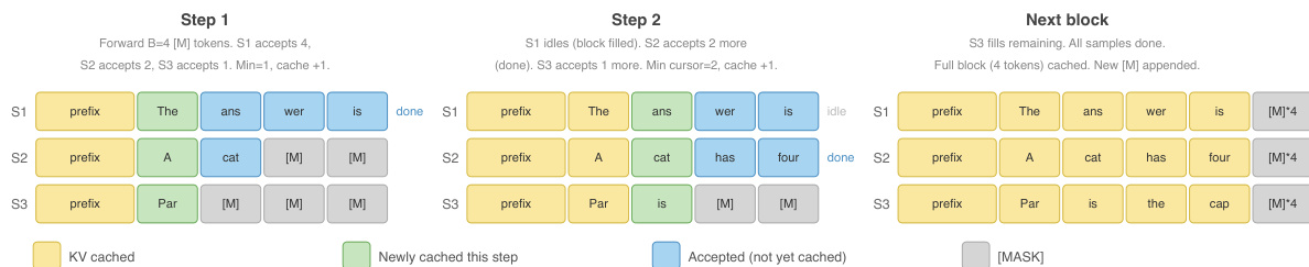 - The work develops a block-level KV caching strategy and a confidence-based thresholding mechanism, which together enable up to 1.71x wall-clock speedup and real-time, on-the-fly throughput adjustments during deployment.