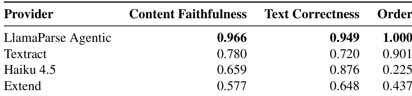 The authors present a breakdown of content faithfulness on a multi-column document, separating text correctness from reading order to reveal distinct failure modes. LlamaParse Agentic outperforms all other providers by maintaining perfect reading order while preserving text accuracy. Competing models exhibit specific weaknesses, such as interleaving columns or duplicating content, which disproportionately impact either the order or correctness sub-metrics. LlamaParse Agentic achieves perfect reading order and the highest overall faithfulness score. Haiku 4.5 maintains high text correctness but fails significantly on reading order due to column interleaving. Textract preserves reading order reasonably well but suffers from content duplication that lowers text correctness.