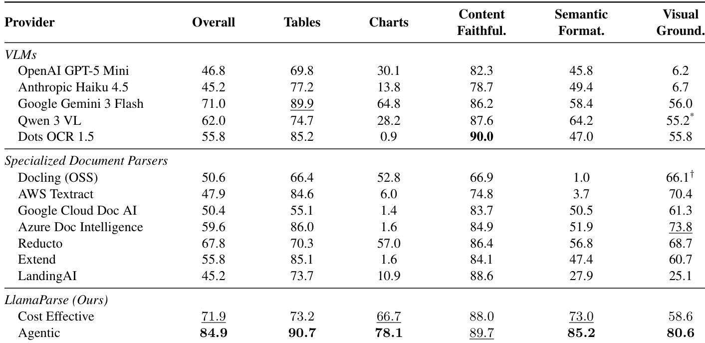 - Experiments across 14 methods spanning vision-language models and specialized parsers reveal a fragmented capability landscape where no method is consistently strong across all dimensions. Results indicate LlamaParse Agentic achieves the highest overall score at 84.9%, highlighting specific capability gaps that remain across current systems.