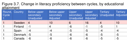 The authors utilize an OECD literacy proficiency chart as a ground truth benchmark to evaluate how well document parsers can extract structured data from complex 3D visualizations. The the the table presents reference values for proficiency changes across multiple countries and educational levels, which parsers must accurately reproduce to pass the evaluation rules. This setup specifically tests the ability to associate numerical values with the correct country and education labels in a dense chart layout. The the the table organizes proficiency changes by country and three distinct educational attainment levels. Columns differentiate between unadjusted and adjusted metrics for upper secondary and tertiary education. The benchmark evaluates parser accuracy against these specific ground truth values for countries like Sweden and Finland.