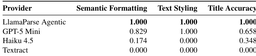 The authors evaluate document parsers on their ability to preserve semantic formatting, such as bold text and heading hierarchy, using a specific infographic example. LlamaParse Agentic outperformed all competitors by maintaining perfect structure and styling, while other models exhibited distinct failure modes like flattening hierarchies or ignoring formatting entirely. LlamaParse Agentic achieved perfect performance across semantic formatting, text styling, and title accuracy. GPT-5 Mini successfully preserved inline text styling but failed to maintain the correct heading hierarchy. Haiku 4.5 and Textract received no credit for text styling due to incorrect syntax usage or a lack of formatting preservation.