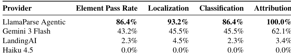 The authors evaluate visual grounding performance on a specific corporate annual report page to test the ability to decompose complex layouts into semantic elements. LlamaParse Agentic demonstrates superior capability, achieving high accuracy in localization and perfect attribution, while other providers struggle with granularity. In contrast, models like Haiku 4.5 and LandingAI fail to identify individual elements, producing coarse predictions that do not match the ground truth. LlamaParse Agentic leads the evaluation with near-perfect localization and perfect attribution scores. Gemini 3 Flash detects a portion of the elements but fails significantly on classification and attribution. LandingAI and Haiku 4.5 produce very few predictions that fail to correspond to individual layout elements, resulting in negligible pass rates.
