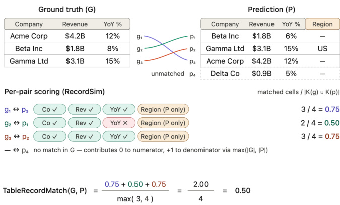 For the specific task of table extraction, precise evaluation is essential. The authors utilize a metric called TableRecordMatch to quantify the alignment between ground truth and predicted records. This metric scores the prediction based on matched cells and accounts for unmatched entries. The calculation is defined as follows: