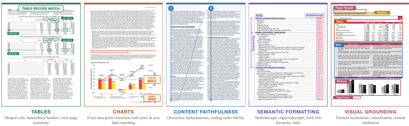 - The paper introduces ParseBench, a benchmark of approximately 2,000 human-verified pages from enterprise documents organized around five capability dimensions. This resource addresses semantic correctness requirements for autonomous decisions by spanning insurance, finance, and government sectors.