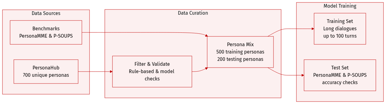 - Subsets and Distribution: The data is split into 500 personas for training and 200 personas for testing. Training dialogues consist of 20 to 100 turns and simulate a timeframe of up to one month.