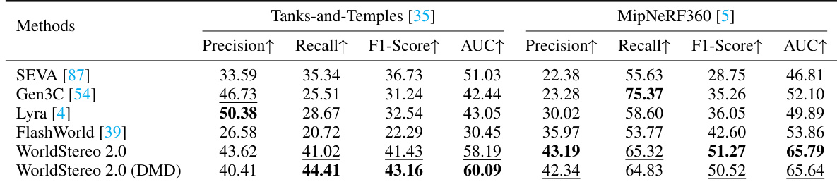 The the the table presents a comparison of single-view 3D reconstruction methods on two benchmarks, Tanks-and-Temples and MipNeRF360. Results show that the proposed WorldStereo 2.0 method achieves the highest performance across most metrics on both datasets, with particularly strong improvements in precision and F1-score. The method also demonstrates superior geometric consistency and physically plausible 3D structures compared to existing approaches. WorldStereo 2.0 achieves the best scores on most metrics for single-view 3D reconstruction It shows significant improvements in precision and F1-score over prior methods The results confirm the ability to synthesize highly consistent and plausible 3D structures