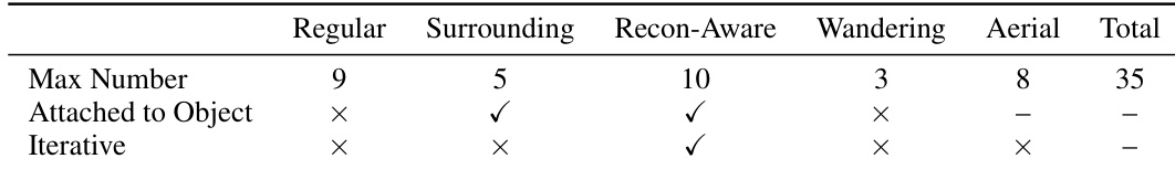 The the the table presents an ablation study on trajectory planning components, showing the maximum number of views generated by each trajectory type and whether they are attached to objects or iterative. Regular and surrounding trajectories generate the highest numbers, with surrounding views being attached to objects and iterative. Aerial and wandering trajectories generate fewer views, with none attached to objects or iterative. Regular and surrounding trajectories generate the most views, with surrounding views attached to objects. Aerial and wandering trajectories generate fewer views and are not attached to objects or iterative. Surrounding and recon-aware trajectories are iterative, while regular and wandering are not.