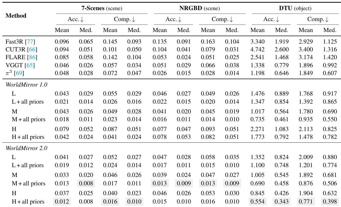 The the the table compares the performance of WorldMirror 1.0 and WorldMirror 2.0 across different datasets and resolutions. Results show that WorldMirror 2.0 consistently outperforms WorldMirror 1.0, particularly at higher resolutions, and benefits from the integration of geometric priors. The improvements are most pronounced in the 7-Scenes dataset. WorldMirror 2.0 achieves better performance than WorldMirror 1.0 across all datasets and resolutions. The integration of geometric priors significantly improves results for both versions, with the largest gains seen in WorldMirror 2.0. WorldMirror 2.0 maintains stable performance at high resolutions, while WorldMirror 1.0 degrades significantly.