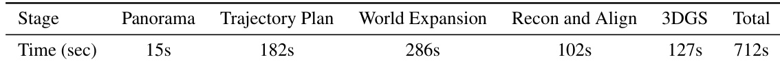 The the the table presents a detailed runtime analysis of the HY-World 2.0 pipeline, showing the time taken for each major stage. The results indicate that world expansion is the most time-consuming component, followed by trajectory planning, while panorama generation is the fastest step. The total runtime for the complete pipeline is summarized, providing insight into the computational efficiency of the system. World expansion is the most time-consuming stage in the pipeline. Trajectory planning takes significantly longer than panorama generation. The total runtime for the full world generation process is 712 seconds.