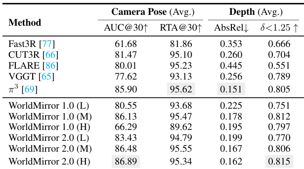 The the the table compares camera pose estimation performance across different methods and resolutions. WorldMirror 2.0 achieves the highest AUC@30 score at high resolution, demonstrating improved accuracy over previous versions and other methods. It also shows consistent improvements in RTA@30 and depth metrics across resolutions. WorldMirror 2.0 achieves the highest AUC@30 score at high resolution WorldMirror 2.0 maintains superior performance across all metrics compared to WorldMirror 1.0 WorldMirror 2.0 shows consistent improvements in RTA@30 and depth metrics across resolutions