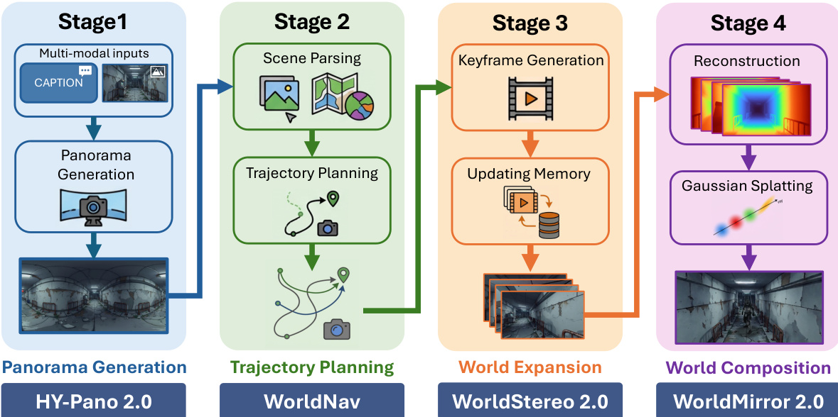 Tencent Hunyuan introduces HY-World 2.0, a multi-modal world model framework that reconstructs and generates navigable 3D Gaussian Splatting scenes from text, single-view images, multi-view images, or videos through a four-stage method involving HY-Pano 2.0, WorldNav, WorldStereo 2.0, and WorldMirror 2.0, while utilizing the WorldLens rendering platform for interactive 3D simulation.