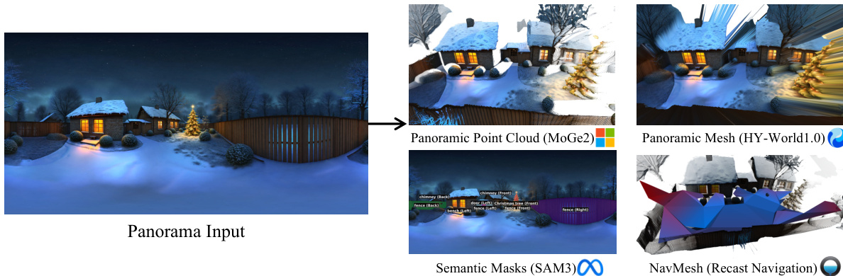 Following the generation of a high-fidelity panorama, the system proceeds to Trajectory Planning. This stage, implemented by the WorldNav strategy, aims to derive exploration trajectories that maximize navigable space coverage. The process begins with a comprehensive geometric and semantic scene parsing of the panorama. This involves constructing a global panoramic point cloud mathbfPpan\\mathbf{P}^{pan}mathbfPpan by aligning monocular depth maps from subdivided perspective views using an optimized LSMR solver. A hybrid filtering strategy, combining vision-language grounding and depth discontinuity removal, is applied to enhance geometric quality. Concurrently, semantic parsing identifies key landmarks and obstacles, with their 3D centroids localized to create 3D masks. A Navigation Mesh (NavMesh) is also constructed using Recast Navigation to define traversable regions. This NavMesh is refined through geometric corrections, such as snapping vertices to the ground and eroding boundaries, to ensure physically plausible camera movement. Based on the parsed scene, WorldNav designs five heuristic trajectory modes: Regular, Surrounding, Reconstruct-Aware, Wandering, and Aerial. Regular trajectories provide a general orbital expansion from the origin. Surrounding trajectories circle significant objects at an adaptive radius to ensure foreground quality. Reconstruct-Aware trajectories are designed to target under-observed regions, identified by degenerate mesh faces, to mitigate gaps in the subsequent 3D reconstruction. Wandering trajectories simulate autonomous agent exploration to reach environmental boundaries, while Aerial trajectories are an auxiliary mode to eliminate blind viewpoints by applying an upward pitch to other trajectories.