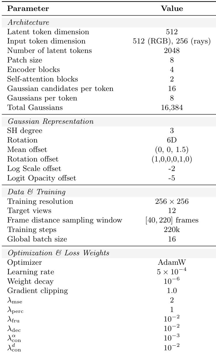Following the iterative refinement, the final latent tokens are decoded into the explicit 3D Gaussian representation. This is achieved through two specialized decoders: a geometry decoder that predicts the 3D mean, anisotropic scale, rotation (using a continuous 6D parameterization), opacity, and an importance score, and an appearance decoder that predicts the view-dependent color coefficients using spherical harmonics (SH) of degree 3. The model employs a coarse-to-fine training curriculum to manage the complexity of the representation. Initially, each latent token predicts a fixed set of 16 Gaussian candidates, but only a single representative Gaussian (G=1G=1G=1) is exposed to the renderer. As training progresses, the capacity is incrementally increased by reducing the merging of candidates, ultimately revealing G=8G=8G=8 Gaussians per token. This staged approach ensures that the model first establishes a stable global geometry before refining local details, preventing representation bloat and improving training stability.