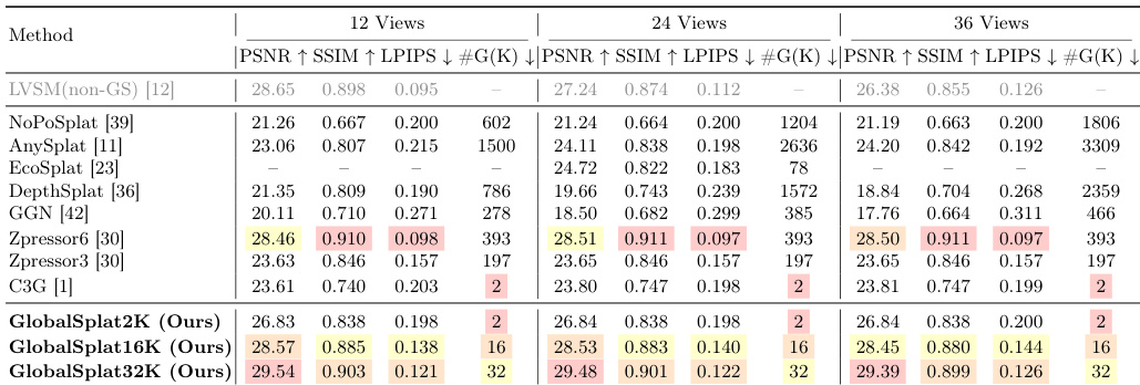 The authors compare their method against state-of-the-art feed-forward novel view synthesis baselines on RealEstate10K, evaluating reconstruction quality, compactness, and efficiency. Results show that their approach achieves competitive image quality with a significantly smaller number of Gaussians compared to other methods, demonstrating a favorable quality-compactness trade-off. The method also maintains strong performance across different numbers of input views and exhibits high computational efficiency. GlobalSplat achieves competitive reconstruction quality while using a fraction of the Gaussians required by other methods. The method maintains consistent performance across 12, 24, and 36 input views, indicating a view-invariant representation. GlobalSplat is the most memory-efficient and fastest method in terms of inference time and disk footprint.