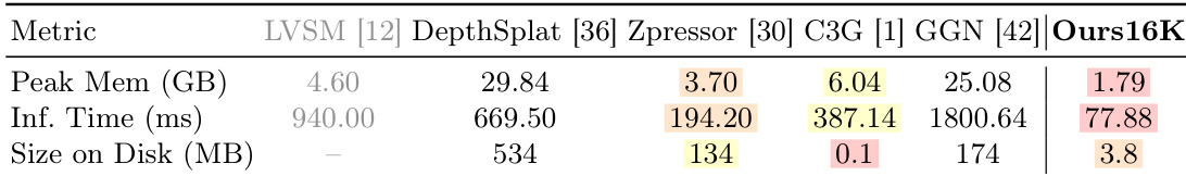 The authors compare the efficiency of their method with several baselines, focusing on peak GPU memory, inference time, and disk size. Results show that their method achieves significantly lower memory usage and faster inference while maintaining a small disk footprint. These efficiency gains are achieved without sacrificing reconstruction quality, highlighting the benefit of a compact representation. The proposed method uses substantially less peak GPU memory and inference time compared to baselines. The method maintains a minimal disk footprint, significantly smaller than all other methods. Efficiency improvements are achieved while preserving high reconstruction quality.