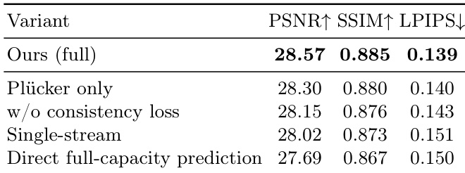 The authors conduct an ablation study to evaluate the impact of different design choices on model performance. Results show that removing the consistency loss or using a single-stream architecture leads to a drop in reconstruction quality, while predicting the full Gaussian capacity from the start also degrades performance. The full model achieves the best results across all metrics. Removing the consistency loss reduces reconstruction quality and increases artifacts Using a single-stream architecture instead of a two-stream design degrades performance Predicting the full Gaussian capacity from the beginning of training leads to worse results than progressive capacity growth