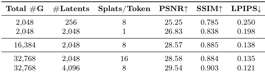 The the the table examines the impact of latent scene representation size and decoder density on reconstruction quality under fixed Gaussian budgets. Results show that increasing the number of latent tokens is more effective than increasing the number of Gaussians per token, with larger latent capacity leading to better performance across metrics. Increasing latent capacity improves reconstruction quality more than increasing Gaussians per token Larger latent representations achieve higher PSNR, SSIM, and lower LPIPS under the same Gaussian budget The trade-off between latent size and decoder density shows diminishing returns for higher decoder density