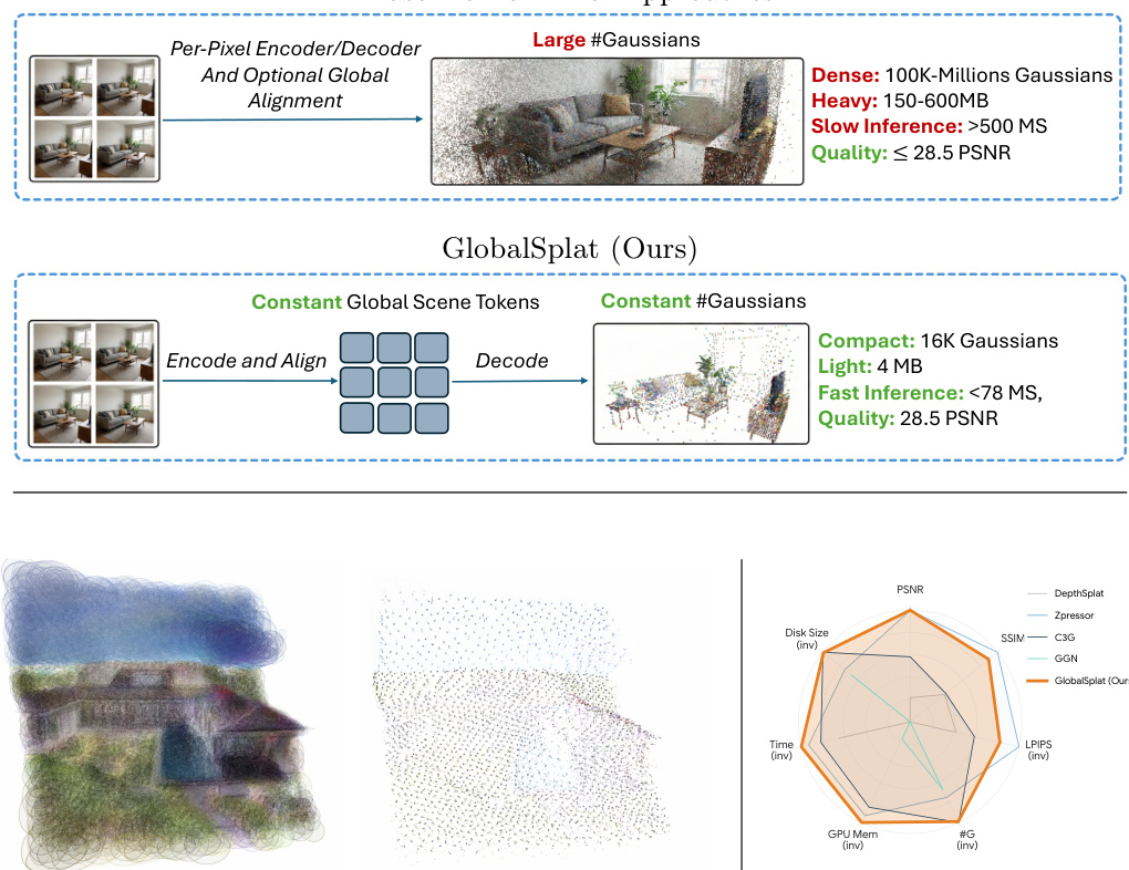 • The paper introduces GlobalSplat, a feed-forward 3D Gaussian Splatting framework based on an "align first, decode later" principle that aggregates multi-view observations into a compact, fixed-size set of global scene tokens. This approach resolves cross-view correspondences within a global latent representation before decoding explicit 3D geometry to eliminate the redundancy found in dense, view-centric pipelines.