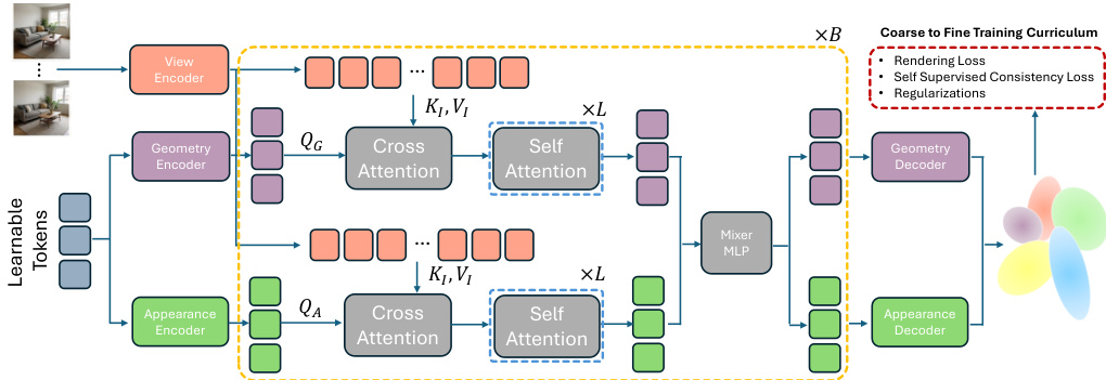 As shown in the figure below, the model initializes a fixed set of M=2048M=2048M=2048 learnable latent tokens, which serve as the primary representation of the scene. These tokens are processed through a dual-branch encoder consisting of B=4B=4B=4 iterative blocks. Within each block, the tokens are projected into separate geometry and appearance streams. The geometry stream processes queries QGQ_GQG that cross-attend to the multi-view features KI,VIK_I, V_IKI,VI and then self-attend to the global context, while the appearance stream performs a similar operation with queries QAQ_AQA. This architectural disentanglement ensures that geometric structure and appearance are processed independently, preventing texture from masking poor structural predictions. The outputs of the two streams are fused via a mixer MLP to update the latent tokens, which are then passed to the next block.