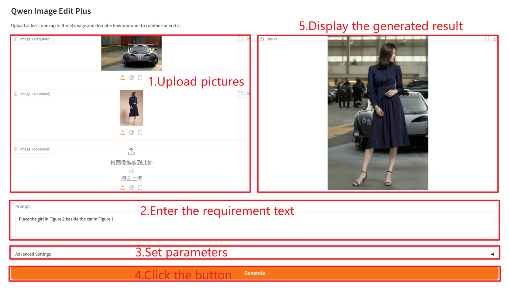• Inference Steps: The number of inference steps used to control the level of detail of the generated image.