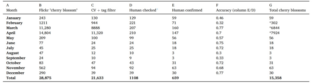 Colonne E :Nombre d'images confirmées comme étant des fleurs de cerisier par inspection manuelle