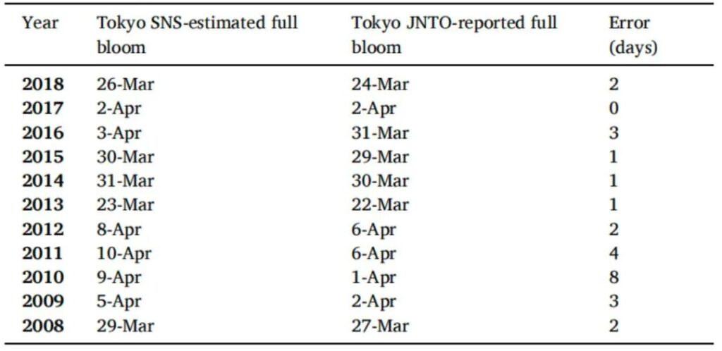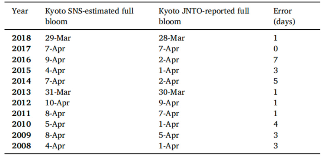 Les premières traces de fleurs de cerisier au Japon remontent à 812 après J.-C., et des observations officielles ont été enregistrées depuis 1953. Pour valider l'approche analytique de l'équipe,L'équipe expérimentale a sélectionné des données provenant de deux villes populaires pour l'observation des cerisiers en fleurs, Tokyo et Kyoto, et les a comparées aux dates de pleine floraison des cerisiers annoncées chaque année par la Japan Meteorological Corporation (JMC) et l'Organisation nationale du tourisme du Japon (JNTO), et a calculé l'erreur entre la date de pointe obtenue dans l'expérience et la date officielle..