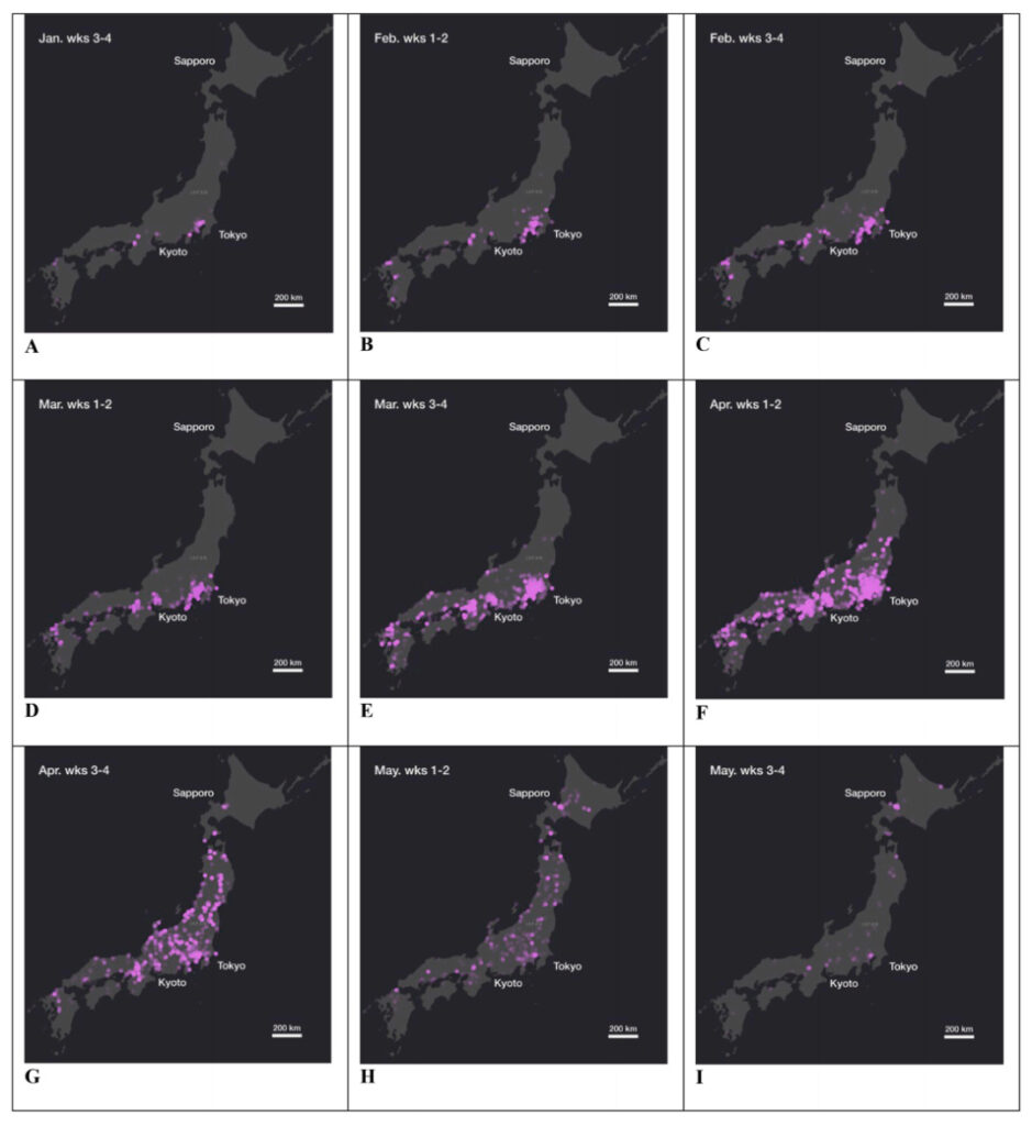 Au travers d'expériences,L'équipe de recherche a obtenu des données spatio-temporelles visuelles sur les fleurs de cerisier en fleurs à travers le JaponDe fin janvier (semaines 3-4) à fin mai (semaines 3-4), les cerisiers en fleurs fleurissent d'abord dans les régions au climat chaud du sud, avancent progressivement vers le nord, et se retirent finalement du sud vers le nord. Comme le montre la figure :