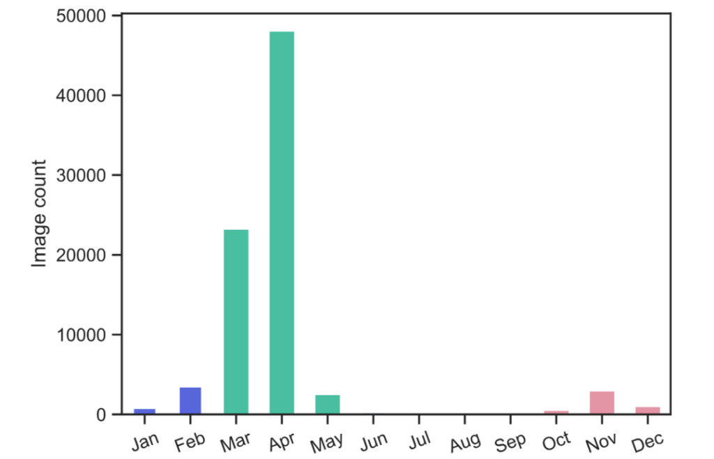 Mars-mai (vert)représente la concentration de données photographiques documentant la principale période de floraison des cerisiers au printemps ;