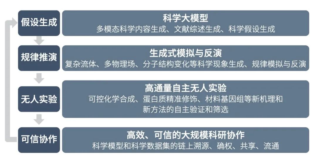 En termes d’innovation,Il est nécessaire de libérer systématiquement et de manière holistique la créativité et la polyvalence de la nouvelle génération d’IA (en particulier l’IA générative et les grands modèles) dans le domaine des sciences fondamentales, de réaliser des fonctions innovantes telles que la génération spontanée d’hypothèses, la déduction automatique de lois, les expériences autonomes sans pilote et la collaboration de confiance auto-pilotée, et de promouvoir l’exploration scientifique itérative à très grande échelle et à grande vitesse.