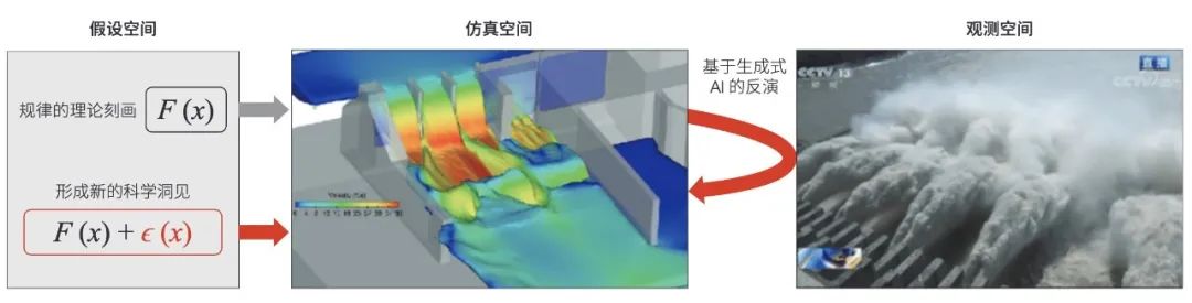 Comme le montre la figure ci-dessus, le réseau neuronal génératif est la structure de base.Le problème de la résolution numérique de systèmes complexes peut être transformé en un problème d’ajustement de données.Une cartographie efficace de l'espace d'hypothèses à l'espace de simulation est établie pour accélérer la solution. De plus, la technologie de rendu génératif peut également réaliser la génération de représentations de phénomènes scientifiques de l'espace de simulation à l'espace d'observation, puis réaliser un apprentissage en boucle fermée à travers les trois espaces « hypothèse-simulation-observation » pour piloter l'inversion des lois.