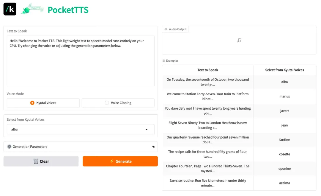 Pocket-TTS est un modèle de synthèse vocale ultra-léger développé par Kyutai Labs. Ce modèle privilégie une faible latence et une sortie en flux continu, afin de fournir des capacités de génération vocale de haute qualité pour les environnements aux ressources limitées ou les scénarios nécessitant une interaction en temps réel (comme les assistants vocaux IA).