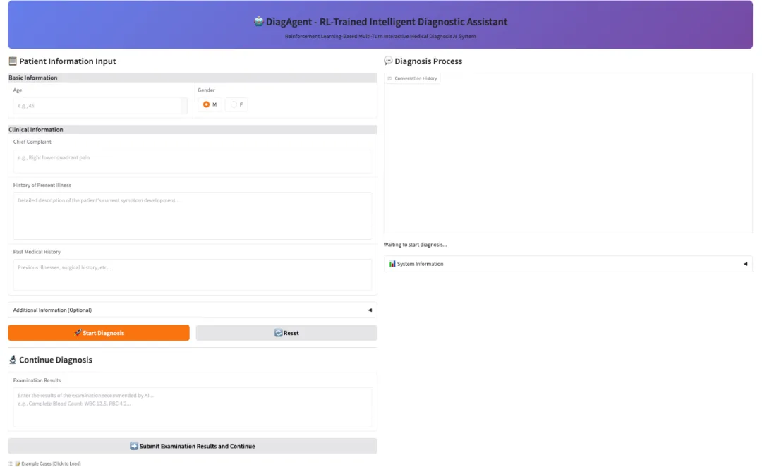 DiagAgent, un agent de diagnostic (7B, 8B, 14B) développé par l'équipe AI4Med de l'Université Jiao Tong de Shanghai et du Laboratoire d'intelligence artificielle de Shanghai, gère proactivement le parcours diagnostique. Il sélectionne les examens les plus pertinents, décide du moment opportun pour les interrompre et fournit un diagnostic final précis. Contrairement aux modèles médicaux traditionnels de grande taille qui ne donnent qu'une réponse unique, DiagAgent peut recommander des examens pertinents et adapter le diagnostic au cours d'échanges successifs, ne fournissant un diagnostic final que lorsque suffisamment d'informations sont recueillies. DiagAgent est optimisé dans l'environnement DiagGym grâce à un apprentissage par renforcement multi-tours de bout en bout (GRPO). À chaque interaction, l'agent commence par une consultation initiale, interagit avec DiagGym en recommandant des examens et en recevant les résultats de simulation, puis décide du moment opportun pour établir un diagnostic final.
