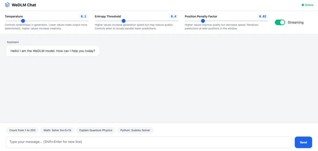 WeDLM (Window-based Efficient Decoding for Large Models) est un framework de décodage de modèles de langage de grande taille et à haute efficacité, développé par Tencent. Il est conçu pour doter les systèmes de dialogue IA de nouvelle génération de capacités de génération de langage ultra-rapides, intelligentes et hautement adaptatives. Ce framework utilise une architecture de décodage parallèle innovante basée sur des fenêtres, ce qui permet d'améliorer considérablement la vitesse de décodage tout en préservant une génération de texte de haute qualité. Son avancée technologique majeure réside dans l'intégration de la prise de décision par seuil d'entropie et de mécanismes de pénalité positionnelle, résolvant ainsi le problème de la limitation de vitesse du décodage autorégressif traditionnel lors de la génération de longues séquences.