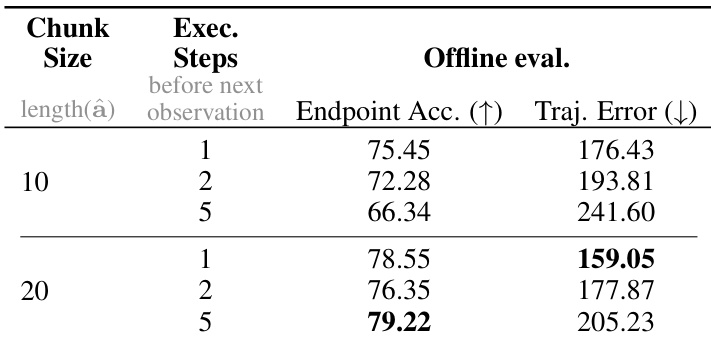 Results show that increasing the chunk size from 10 to 20 improves endpoint accuracy and reduces trajectory error, with the best performance achieved at a chunk size of 20 and one execution step, indicating that longer action predictions and frequent re-observations enhance precision.