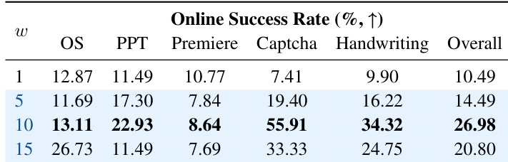 Results show that the online success rate varies significantly with the temporal weighting scale w, where a scale of 10 achieves the highest overall success rate of 26.98%, outperforming other scales across multiple domains, particularly in Captcha tasks. The performance peaks at w=10, indicating that moderate reweighting optimally balances accuracy at critical steps, while higher scales like 15 degrade overall performance due to overemphasis on specific steps.