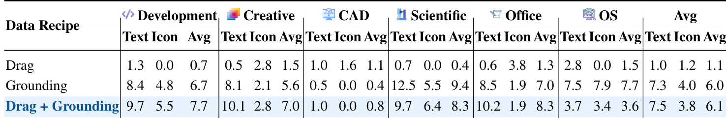 The authors use a data-driven approach to evaluate ShowUI-π on the ScreenSpot-Pro benchmark, comparing performance across different training data recipes. Results show that co-training with both drag and grounding data significantly improves performance, achieving the highest scores in all categories, particularly in Creative and Office domains, where the model benefits from the abundance of relevant data in the ScreenDrag dataset.