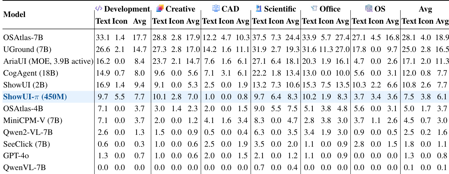 - For model training, ShowUI-π uses ScreenDrag’s training data alongside the desktop Click subset from GUIAct, WaveUI, UGround, and ShowUI-Desktop, excluding all non-Click and mobile data.