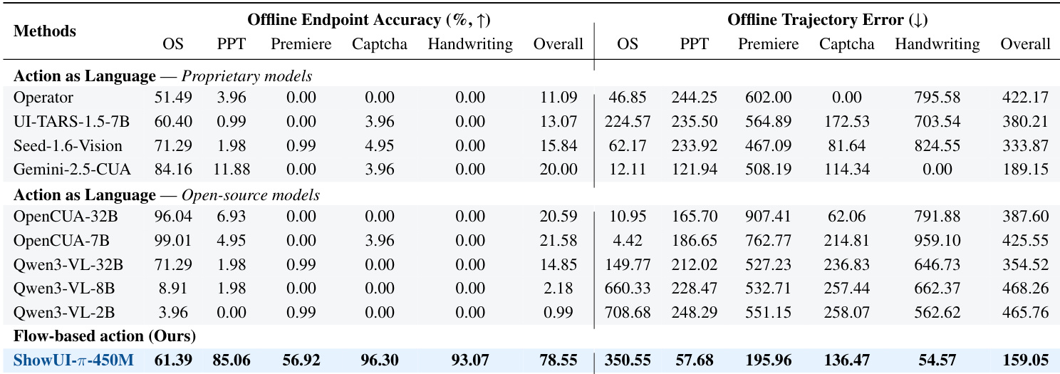 Results show that ShowUI-π-450M achieves the highest offline endpoint accuracy across all domains, particularly excelling in Captcha and Handwriting tasks, while also demonstrating the lowest offline trajectory error compared to all baseline models. The authors use this table to highlight that their flow-based action modeling approach outperforms language-based and diffusion-based methods in both endpoint precision and trajectory smoothness.