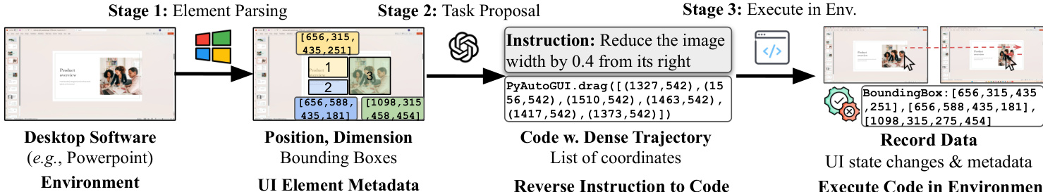 - Data is collected using a scalable pipeline combining automated execution and human demonstrations. Automated data is generated via three stages: (i) element parsing using Windows UI Automation (UIA) or DOM for web-based tasks, (ii) instruction generation via Qwen-2.5-72B LLM, and (iii) trajectory synthesis using PyAutoGUI code executed on real systems.