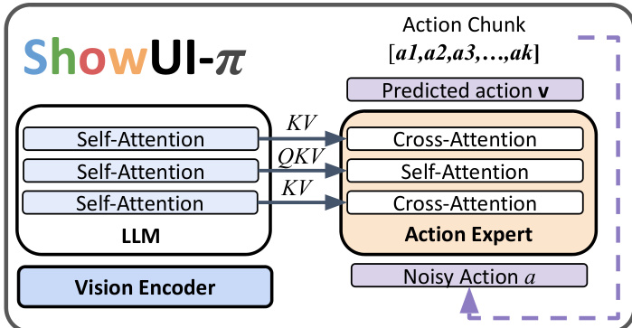 The authors leverage a unified flow-based generative model, ShowUI-π, to enable dexterous GUI manipulation by directly modeling continuous spatial trajectories. The framework is built upon the SmolVLA-450M architecture, integrating a pretrained vision-language model (VLM) with a lightweight action expert. The VLM processes multimodal inputs, encoding visual observations into a unified embedding space alongside projected action states and task instructions. This enables the model to maintain a coherent understanding of the environment and task context. The action expert, a transformer with the same number of layers as the VLM backbone, is responsible for generating action sequences. During inference, the VLM and action expert perform interleaved self-attention and cross-attention, allowing the action expert to condition its predictions on the current visual state and the history of actions. The action state from the previous step is projected back into the VLM backbone to inform subsequent predictions, enabling fine-grained, closed-loop control.