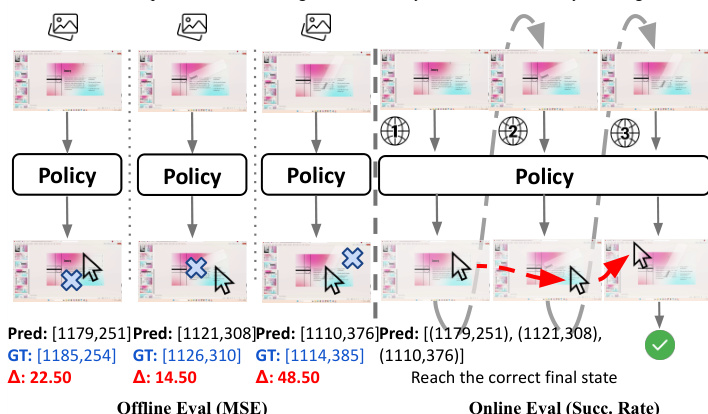 - Offline evaluation validates the model's stepwise trajectory accuracy using Average Trajectory Error (ATE) and Trajectory Endpoint Accuracy (TEA), with ShowUI-π achieving the lowest ATE of 159.05 px and highest TEA of 78.55%, outperforming diffusion policy and language modeling.