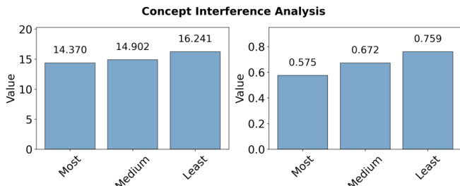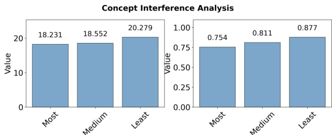 The authors use a concept interference analysis to examine how semantic relatedness affects concept learning during joint training. Results show that training with highly related concepts leads to lower performance (average logit: 14.370, average probability: 0.575) compared to training with weakly related concepts (average logit: 16.241, average probability: 0.759), indicating stronger interference among semantically similar concepts.