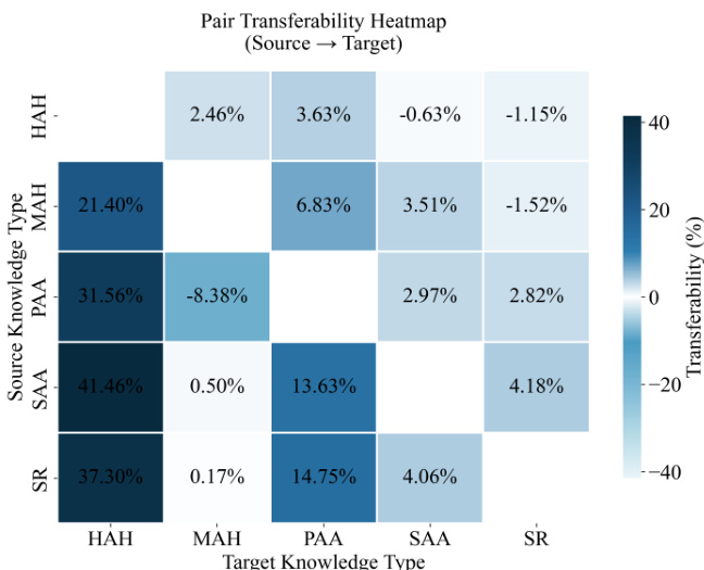 The authors use a pairwise continual-training setup to examine transfer effects between five high-level knowledge categories, measuring paired transferability as the performance gain or loss when transitioning from a source to a target knowledge type. Results show substantial and asymmetric transfer effects, with pretraining on Property & Affordance (PAA) yielding strong gains for Hyponym & Hypernym (HAH) and Synonym & Antonym (SAA), while reverse directions show weaker transfer, indicating directional and uneven benefits across knowledge types.
