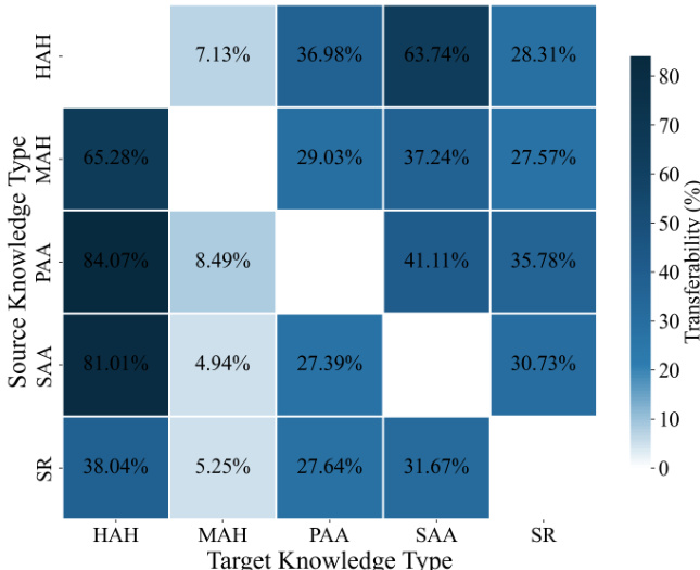 The authors use a heatmap to visualize paired transferability between five high-level knowledge types during continual training, showing that pretraining on one type can facilitate or hinder learning of another. Results indicate substantial and asymmetric transfer effects, with certain source-target pairs exhibiting strong positive transferability, such as from Property & Affordance to Hyponym & Hypernym, while others show minimal or negative effects, highlighting directional dependencies in knowledge acquisition.