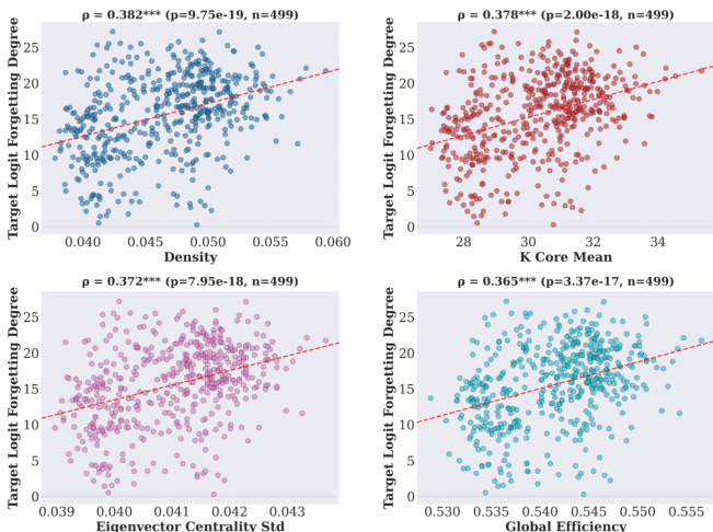 The authors use scatter plots to examine the correlation between concept learning degree and forgetting degree across multiple circuit graph metrics. Results show a consistent positive correlation between learning and forgetting degrees, with statistically significant Spearman correlations observed for metrics such as density, k-core mean, eigenvector centrality standard deviation, and global efficiency, indicating that concepts learned more strongly tend to be more vulnerable to forgetting.