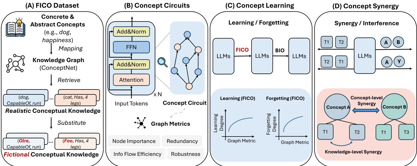 The authors from UC Davis, Virginia Tech, UCLA, and Meta AI propose a circuit-level analysis of concept learning and forgetting in LLMs, revealing that Concept Circuits—computational subgraphs linked to specific concepts—exhibit stage-wise dynamics, semantic interference, and transferability, enabling interpretable, robust training strategies through graph-based characterization of concept interactions.