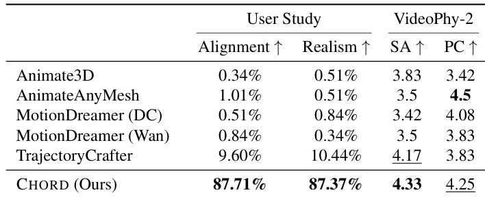Results show that the proposed method, CHORD, achieves the highest scores in both user study metrics—Alignment and Realism—outperforming all baselines. In the VideoPhy-2 evaluation, CHORD attains the second-highest score in Physical Commonsense and the highest in Semantic Adherence, demonstrating superior prompt alignment and natural motion generation compared to existing approaches.