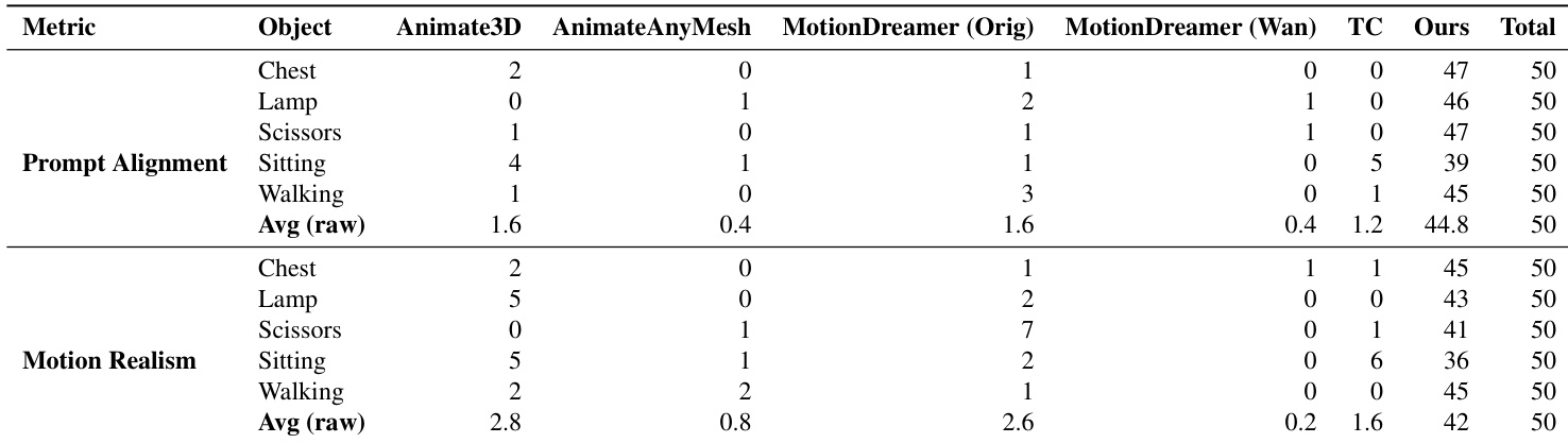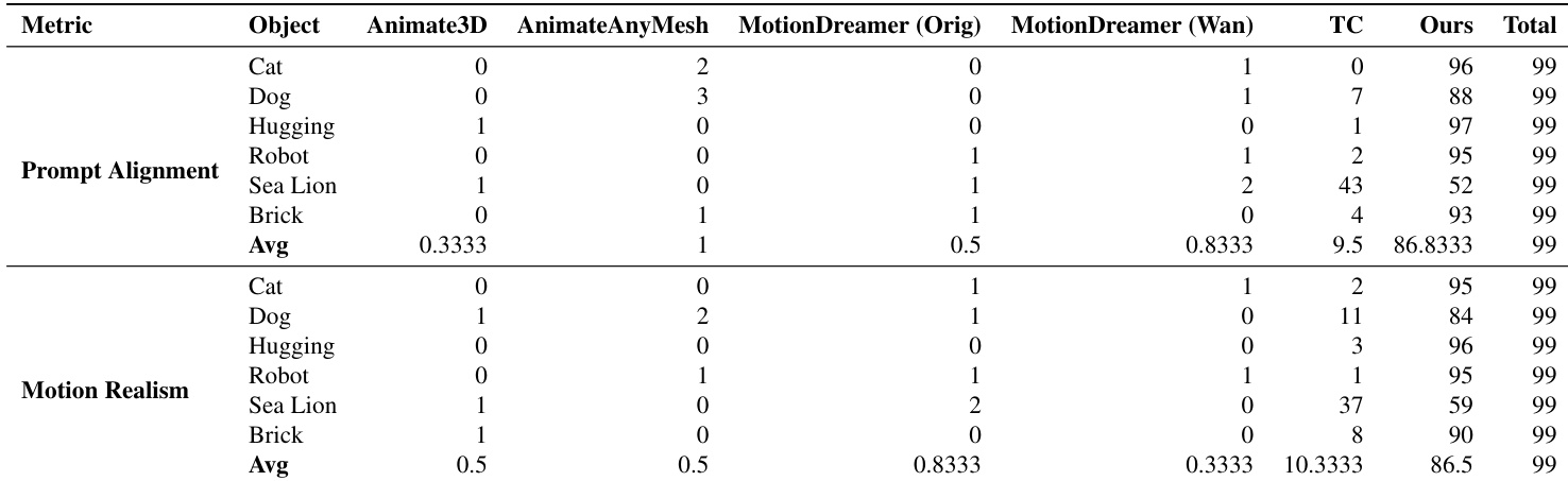 - On single-object animation tasks, achieved 89.6% preference for prompt alignment and 84% for motion realism in a 50-participant user study, with full results in supplementary tables.