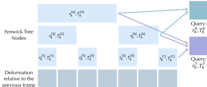 To further improve temporal coherence, the authors introduce a temporal hierarchy using a Fenwick tree data structure. As shown in the figure below, the sequence of deformations for each control point is represented as a set of nodes in the Fenwick tree, where each node encodes the accumulated deformation over a specific range of frames. This range-based decomposition allows deformations at different frames to share parameters through overlapping intervals, which greatly improves temporal coherence and enables the learning of long-horizon motion. The final deformation at a given frame is obtained by composing all relevant nodes from the Fenwick tree.