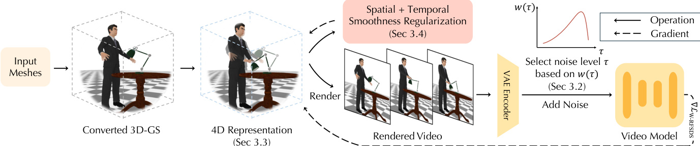 The authors leverage a hierarchical 4D representation to enable the distillation of dynamic 4D scenes from static 3D meshes, using a modified Score Distillation Sampling (SDS) framework tailored for Rectified Flow (RF) video generative models. The overall framework begins with input meshes, which are first converted into 3D Gaussian Splatting (3D-GS) representations to facilitate smooth gradient computation. This 3D-GS model serves as the canonical shape, which is then used to initialize a 4D representation that captures temporal motion. The 4D representation is refined iteratively by sampling camera poses, rendering corresponding videos, and passing them through a video generation model to obtain optimization gradients. The process is guided by a novel SDS target derived for RF models, which aligns the optimization objective with the model's training loss. As shown in the figure below, the framework integrates spatial and temporal regularization to stabilize the optimization process and ensure coherent motion.